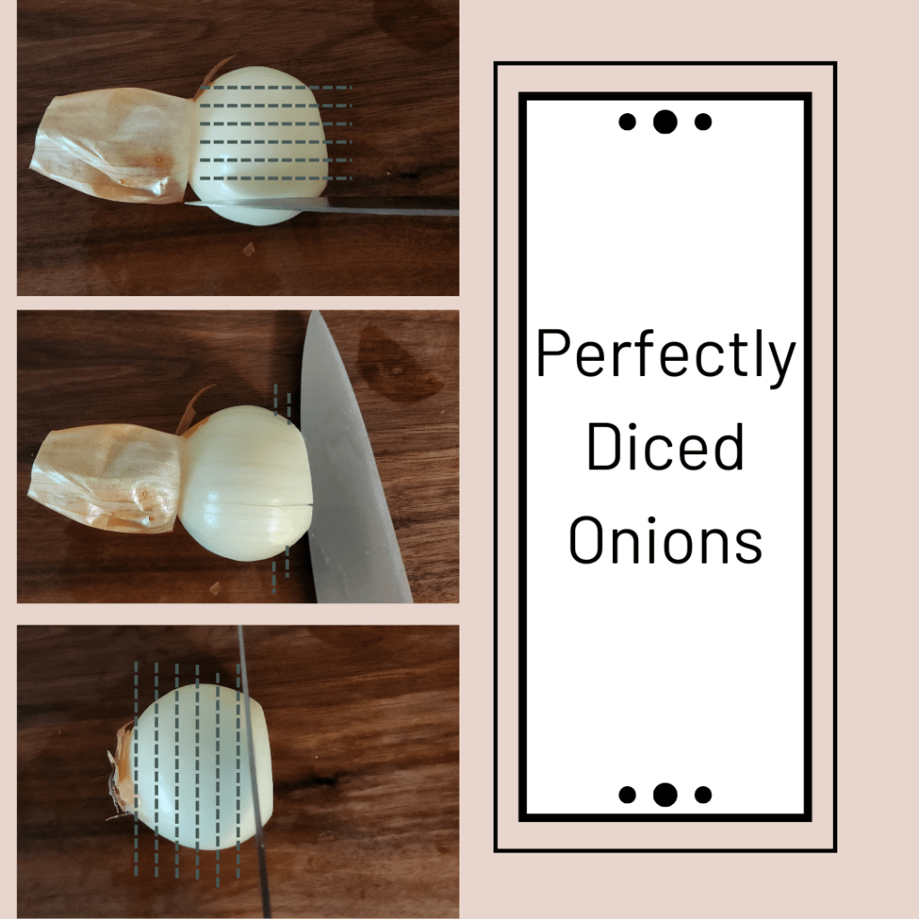 The first step is to prepare your onion for cutting. Regardless of the form you plan your onions to be in their final stage, preparation is almost always the same. Take your onion and cut off the cap at the stem (not the root). Then, cut your onion in half from stem to root. My process for this and other cuts is usually to place the knife in its spot to cut, then put my hand over the knife to hold the onion in place. Once this is done, you can easily peel back the outer skin of each side without much issue of it splitting and splintering. See image above for the step by step.